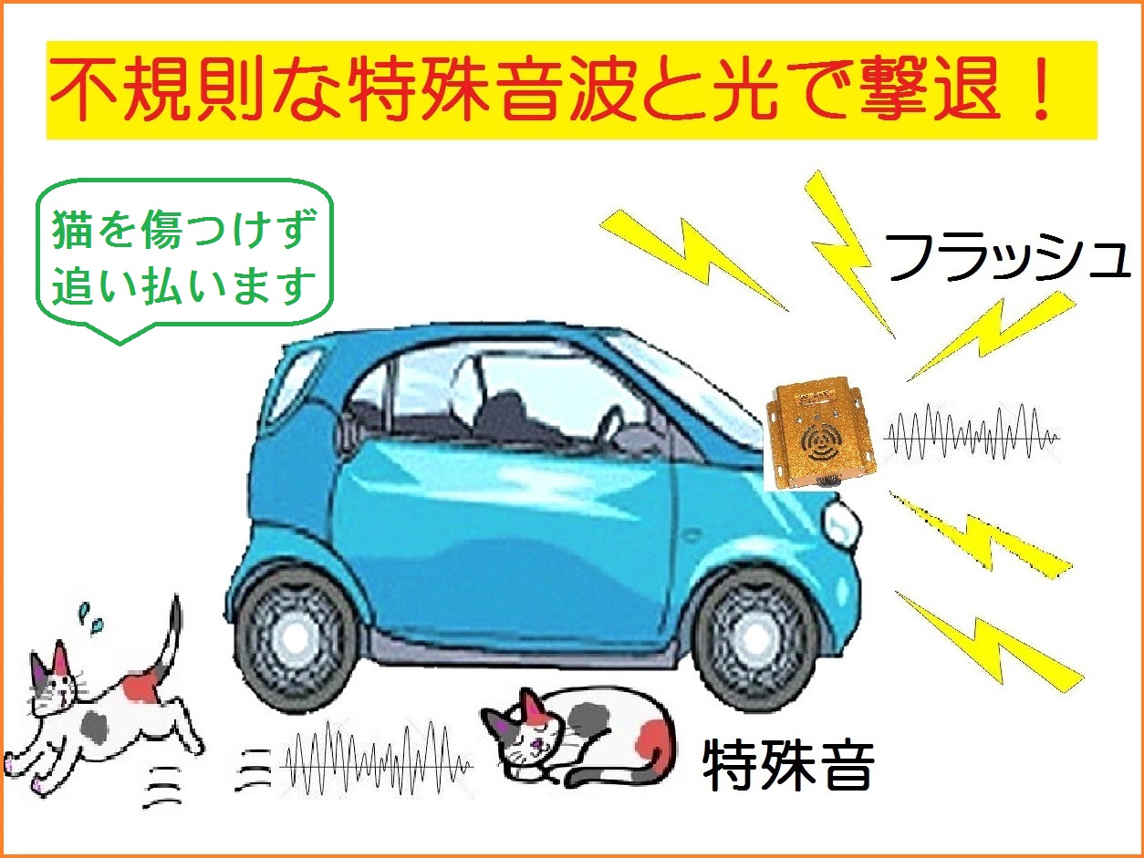 | 自動車の下やエンジンルームの中に猫が入ったり居座らないようにする製品です。不規則な超音波と複数のLEDの点滅パターンで猫を傷つけず追い出します。