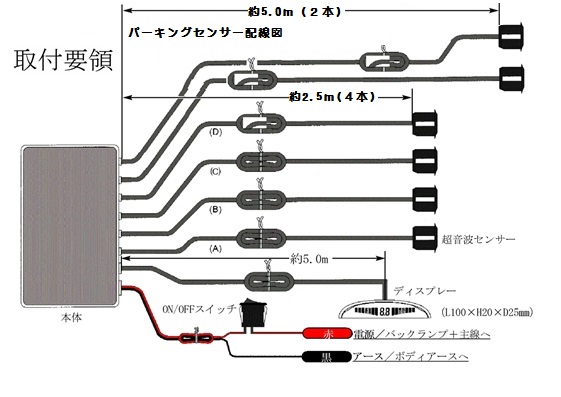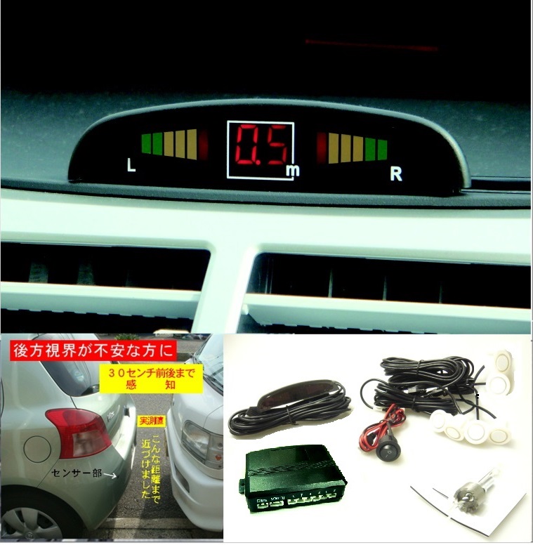 国産ディーラーで装備されるバックセンサーのように取り付けができる(バックセンサー)パーキングセンサーです。障害物までの距離をL&R(方向を示すLED)と数字と音で教えてくれます。車検もOKです。