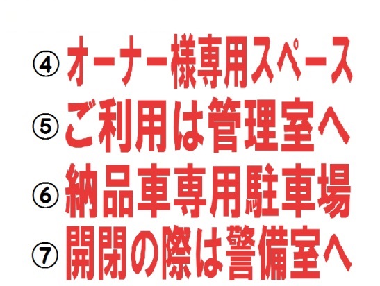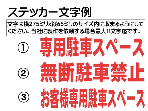 繁華街の店舗、個人商店の配達車用駐車スペースなどへの進入を視覚的におしらせし、無断進入を防止します。 ステッカーの文字はご希望のものを製作することも可能です。 |