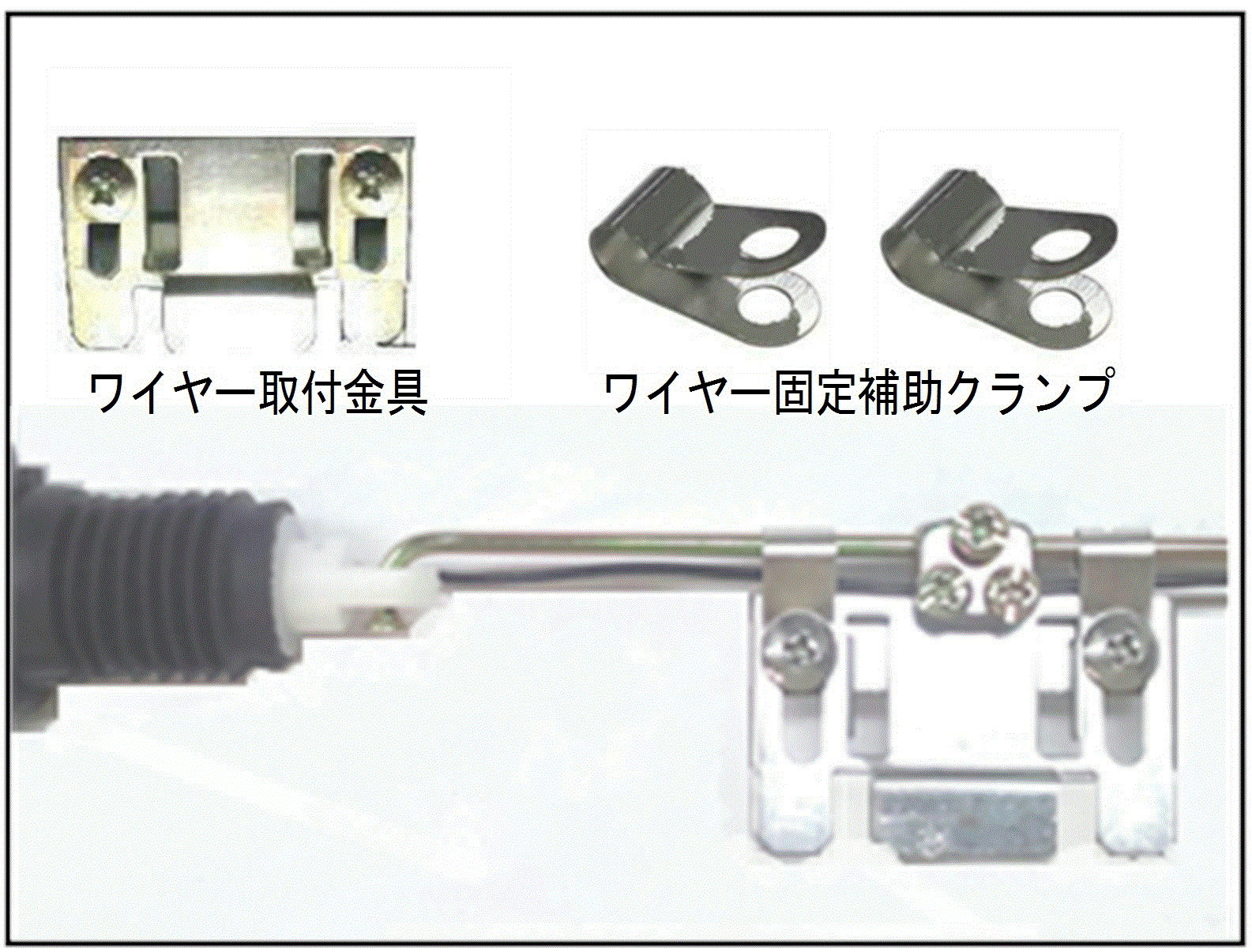 ワイヤー取付金具X1、ビス×2 ワイヤー固定補助クランプ×2、