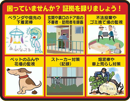 夜間は光って犯人に威嚇。同時に隠しカメラで映像と音声を記録。防犯記録、証拠撮影!