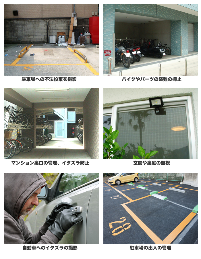 駐車場での車やバイクへのイタズラやパンク犯。企業の休業日の駐車場や月極駐車場を狙った窃盗犯、裏口での酔っ払いの放尿やゴミ置き場への不法投棄。