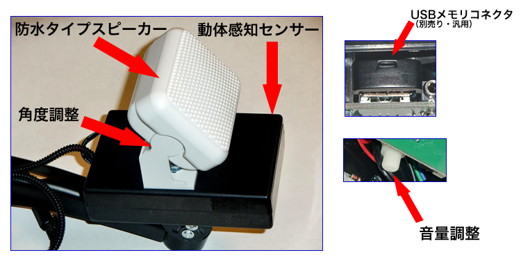 ●動体感知センサーが人間、犬やネコ等の動物やバイク等の動体に反応して付属のスピーカーから音声や音楽を