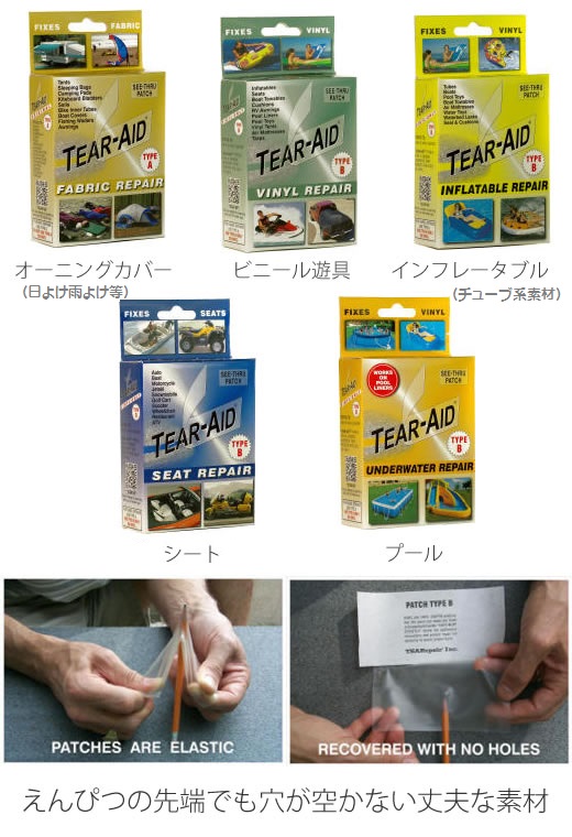 素材の特長を生かしたまま補修ができるティアエイド補修キットです。補修したい場所に必要な大きさで貼り付けるだけと簡単です。用途に応じて種類があります。米国トップクラスの補修剤です。